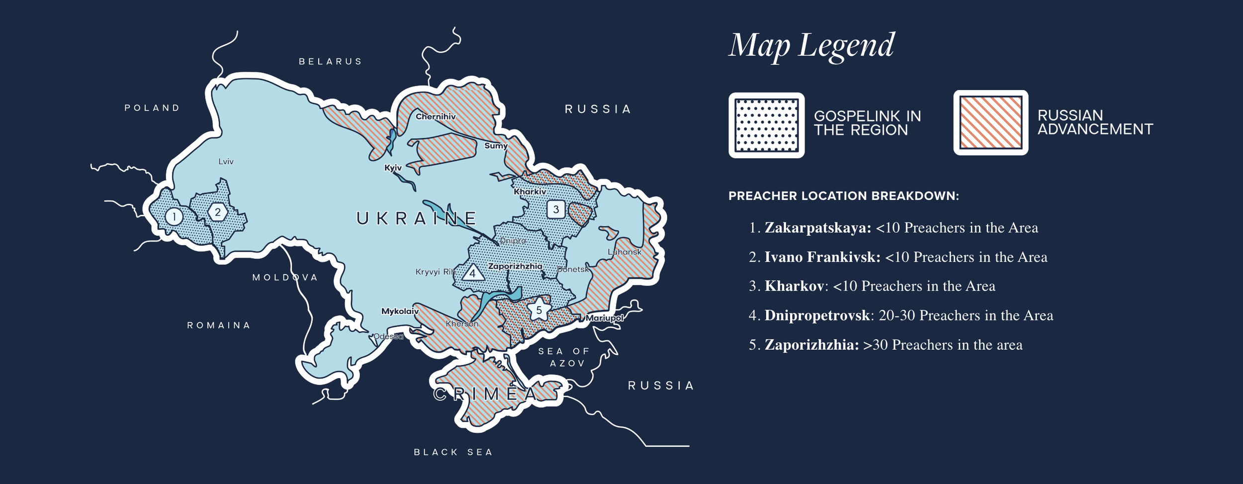 Gospelink is involved in supporting 74 different national preachers in five different regions in Ukraine. About 80% of these men are in the eastern/Russian side of Ukraine. (If you follow maps, the two main regions are Zaporizhzhia and Dnipropetrovsk.) Thus far these two regions have experienced very little conflict - partly because they are not close to the capital and possibly because there is a majority of ethnic Russians living there.